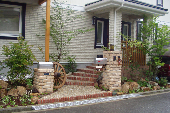 レンガ敷き、乱貼り板石敷き、化粧砂利洗い出しなどのアプローチやレンガ階段、ピンコロ石階段、バリアフリーアプローチなど、長さや幅も予算やお好みに合わせてお選びいただけます。
