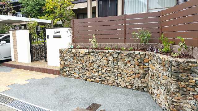 【写真右】 石垣と樹脂フェンスの間に植栽スペースを設け、お互いがより引き立つよう設計されています。 石の力はほんとに凄いですね。 使い方によっては100万円、200万円とお庭の価値が上がっていきます。