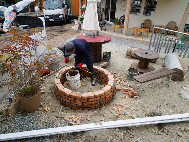 お店の緑化工事の現場から、カンカンとレンガを叩く音が。