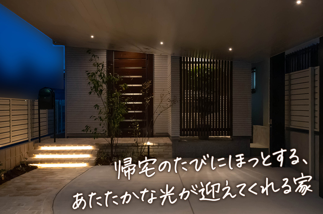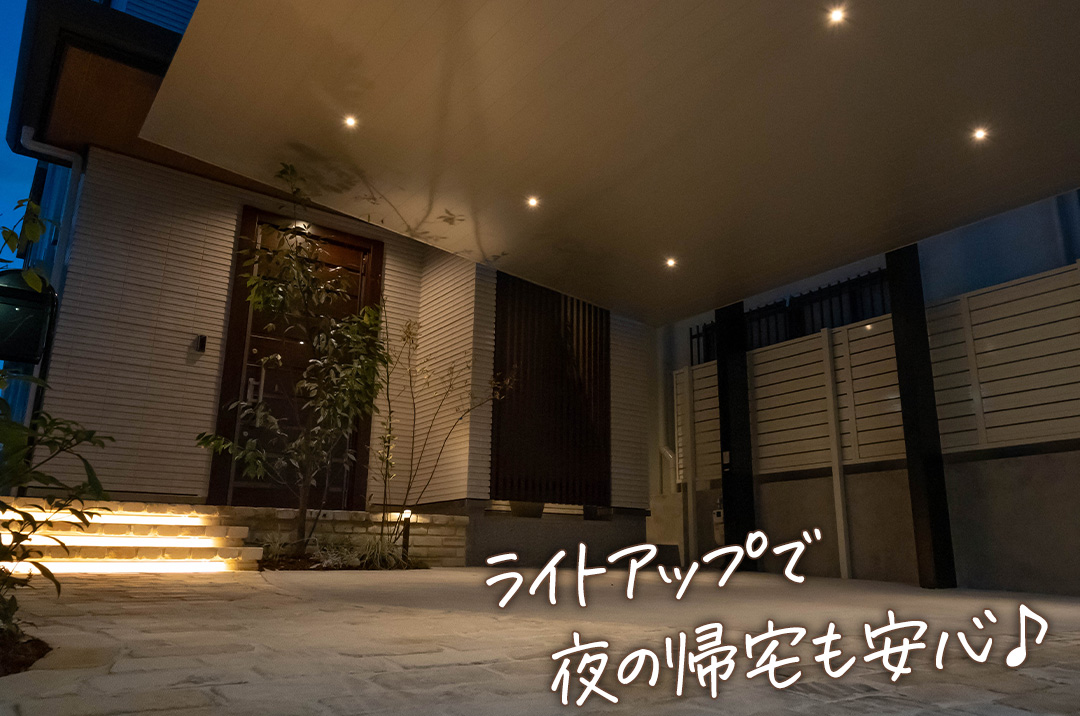 見落としがちな夜の見映えや使い勝手にもこだわった外構プランで、ご家族の笑顔あふれる暮らしをサポートいたします。