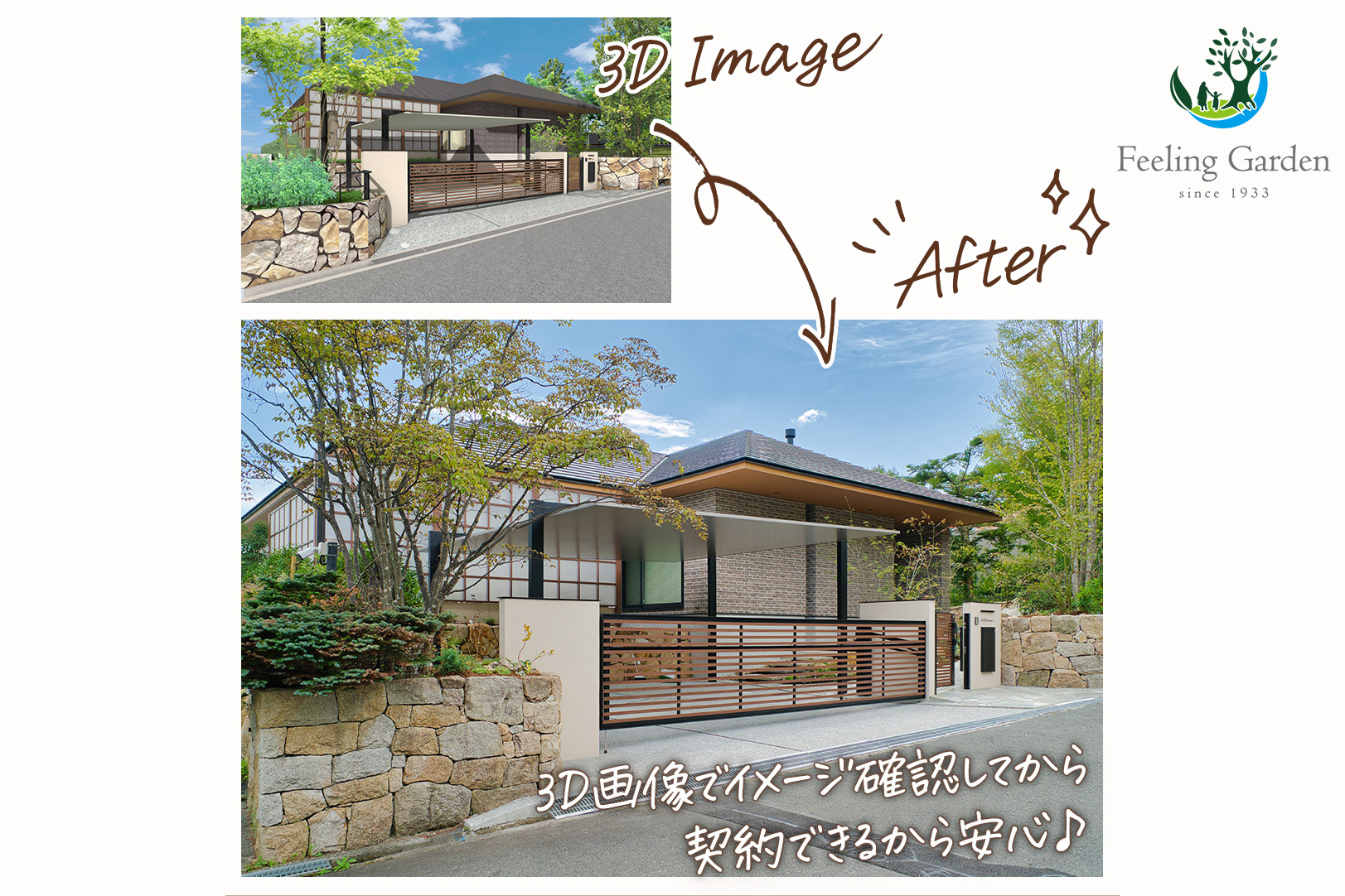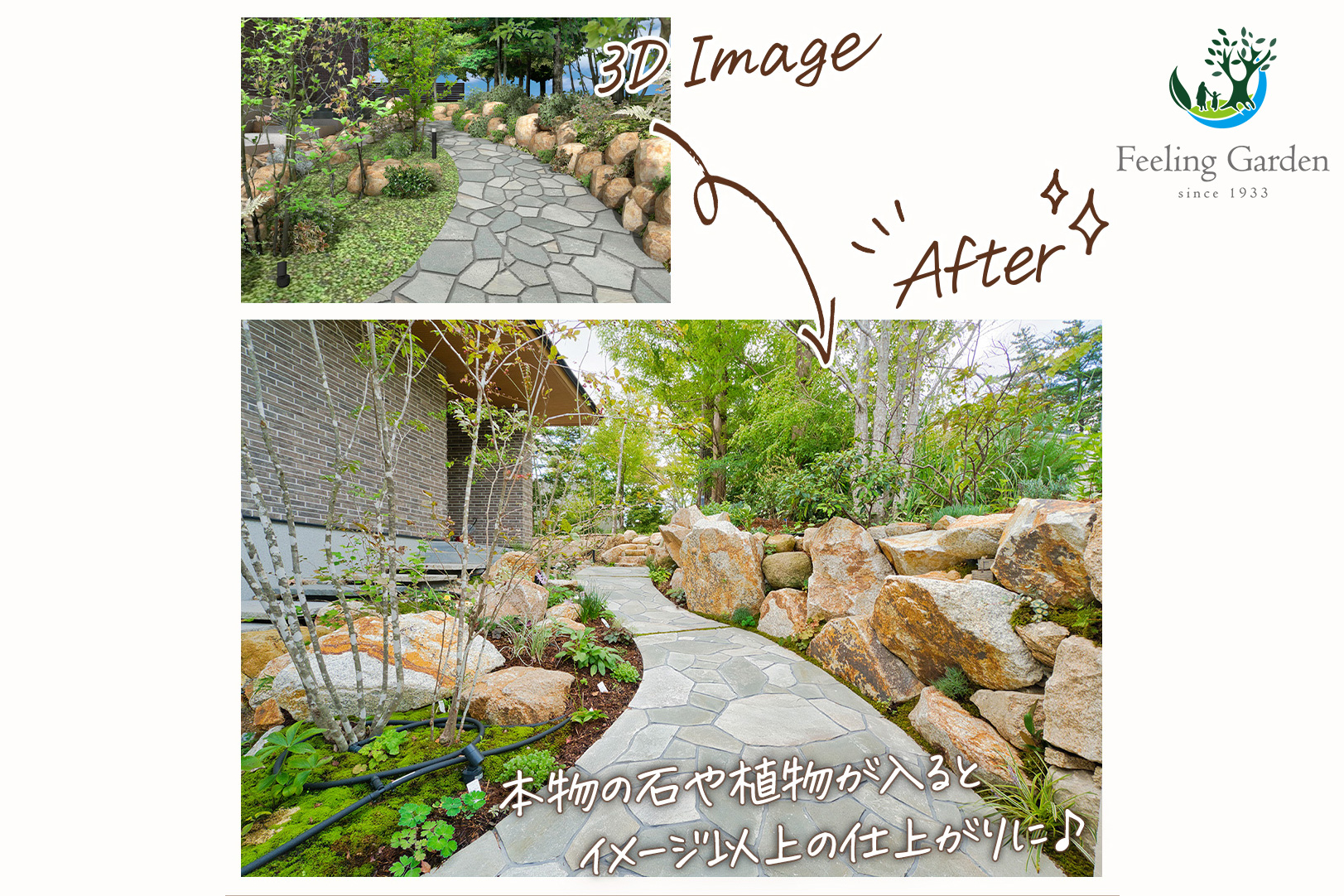平面図よりもわかりやすい3D画像と、自然の石や植物が入ることで3D画像よりもさらに魅力的に仕上がった完成写真を、ぜひ見比べてみてください!