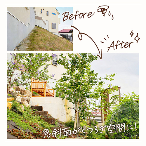 6.愛犬も大喜び!高低差5mの急斜面がくつろぎのお庭に