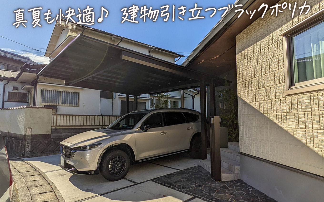 そこで設計担当が各メーカーの商品を探し回り、すべての条件を満たす、新商品のブラックポリカのカーポートがシンデレラフィットすることを発見!