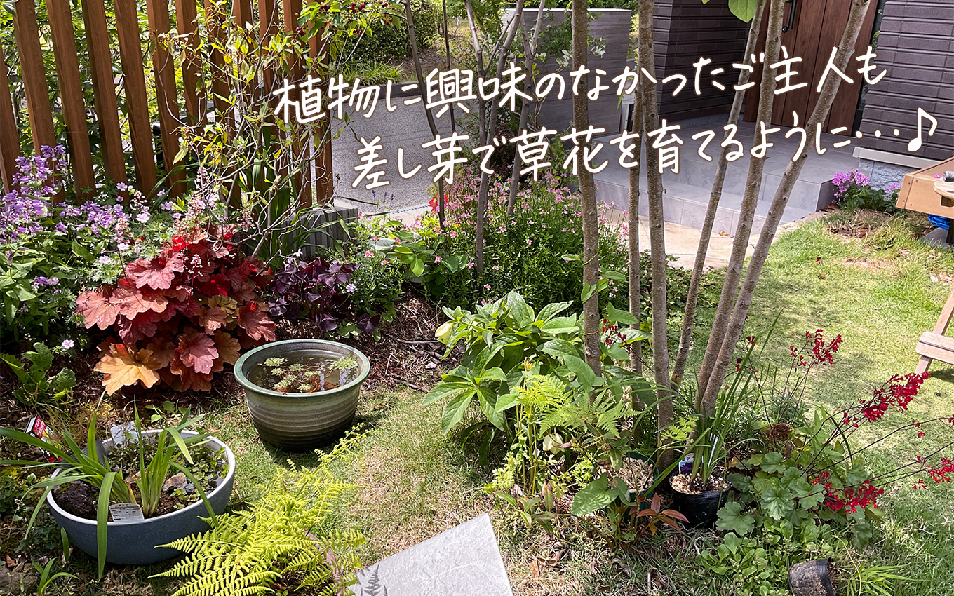 お庭の植物をいろいろと挿し芽してうまく育つか試したり、水鉢で水草を育てたりして楽しまれています。