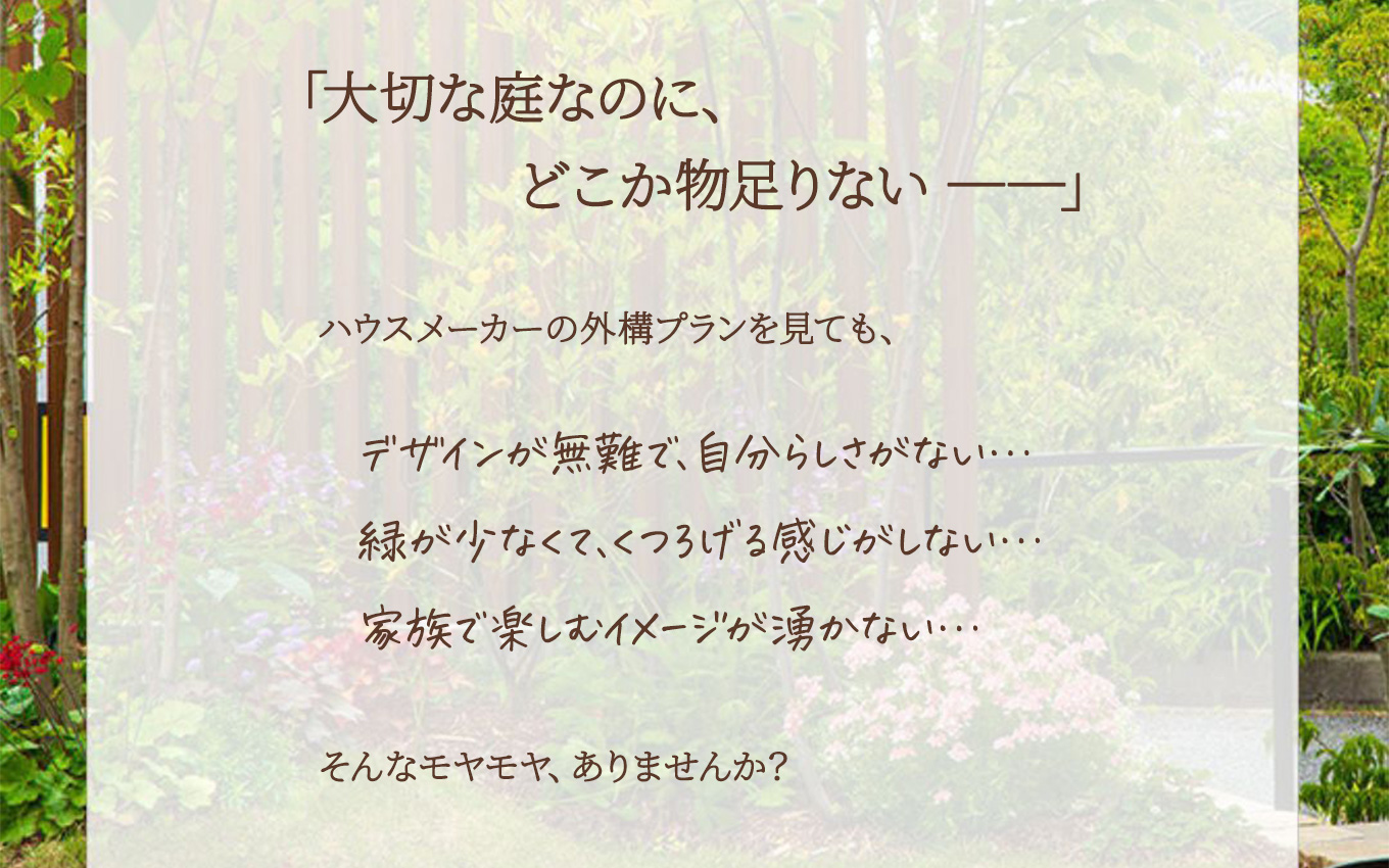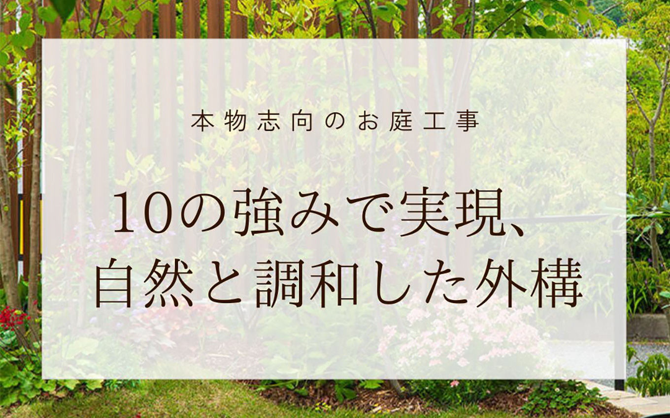 ハウスメーカーではかなえきれない“庭のときめき”を。無償保証と建築基準法対応の安心も、『10の強み』ページでご確認ください。外構はぜひフィーリングガーデンへ。