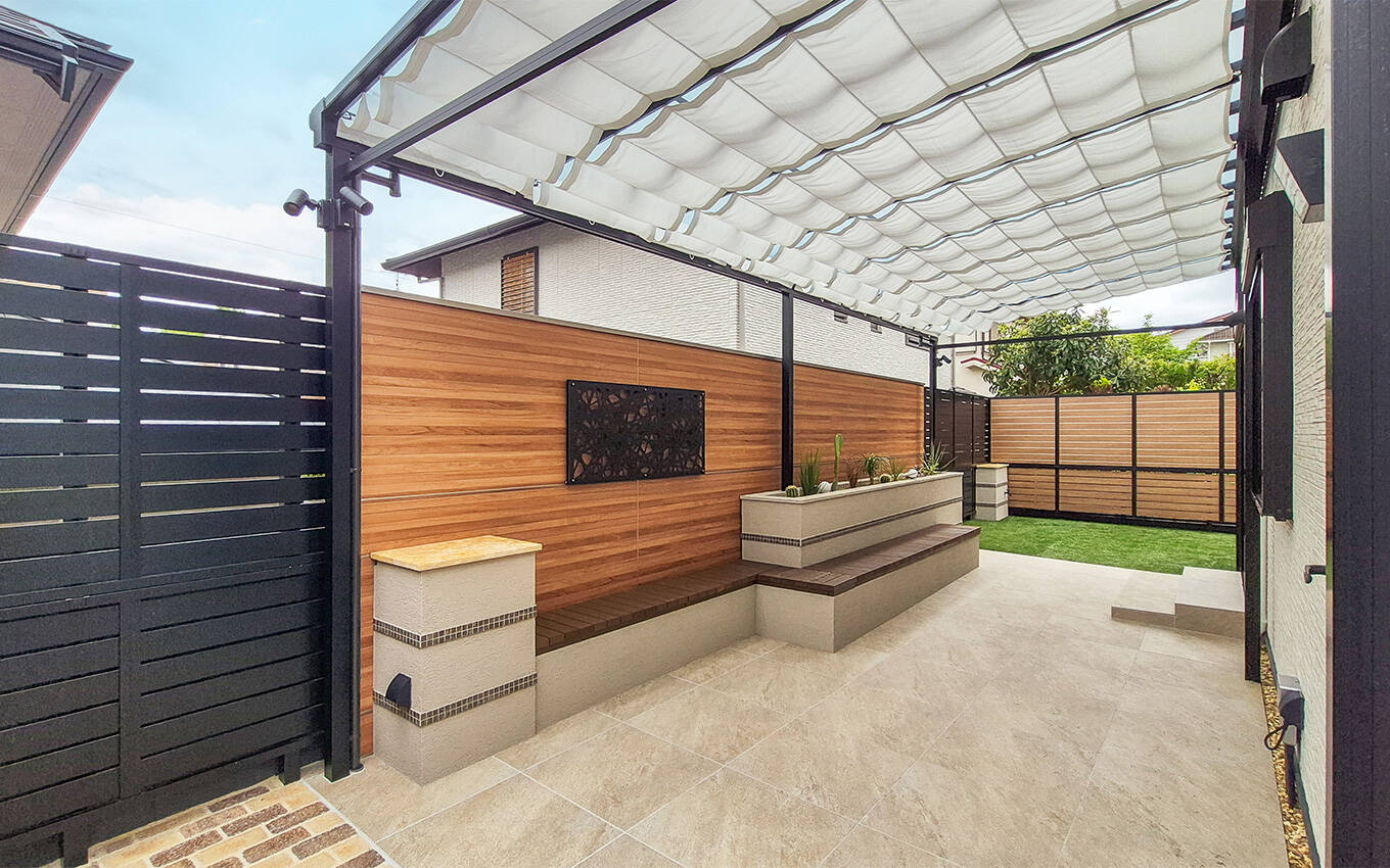 全面舗装&屋根設置に加え、ドッグランやちょこっと植物を組み合わせることで、忙しいご家族の“手がかからず家族で楽しめる暮らし”を叶えました。特に階段の段差や幅、ベンチの収納性など、細部まで打ち合わせを重ねたことで、“家族みんなが自然と集まる庭”へと生まれ変わっています。