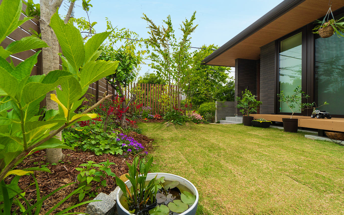 ロックガーデン、天然芝(TM9)、菜園スペース、樹脂デッキをワンセットでプランニングし、四季折々の表情を演出