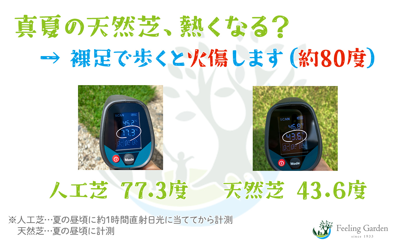 同じく夏の昼頃に計測した日なたの天然芝は、朝から日が当たっていたにも関わらず、43.6℃。