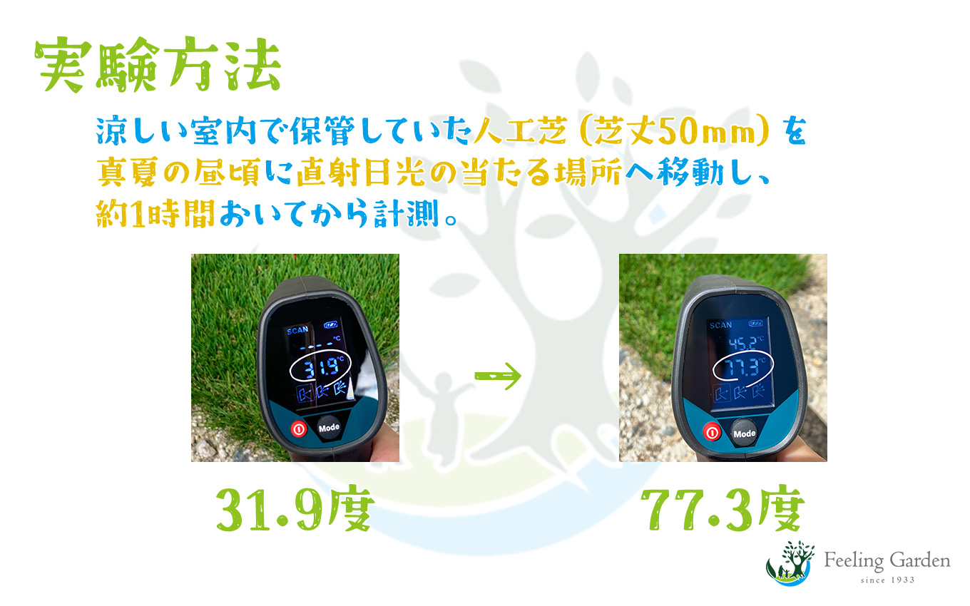 そこで、お庭を少しでも涼しくするためにできることはないかと、「人工芝」と「天然芝」との温度差を比較。