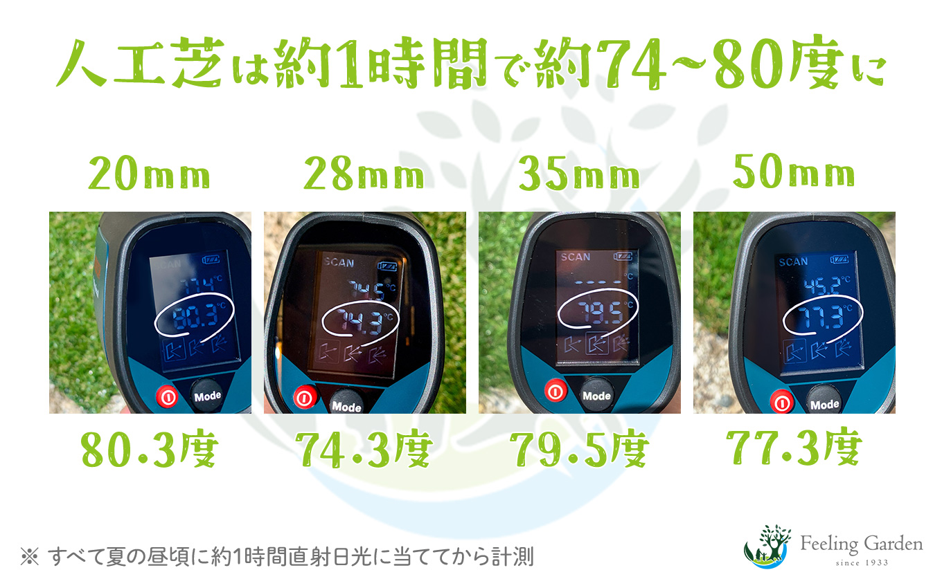 芝丈によって多少ばらつきはあるものの、どれも“熱いアスファルト”のような高温になっていました。