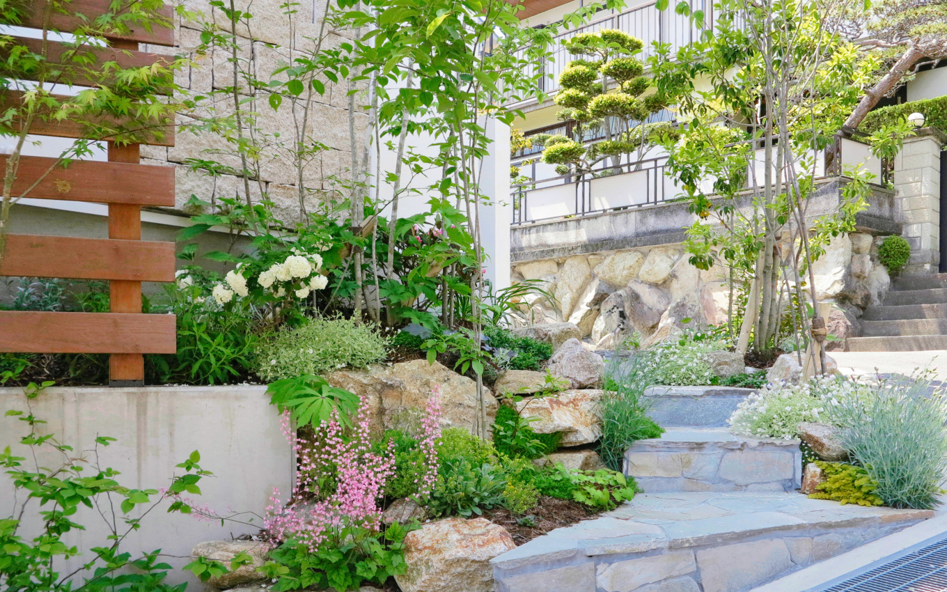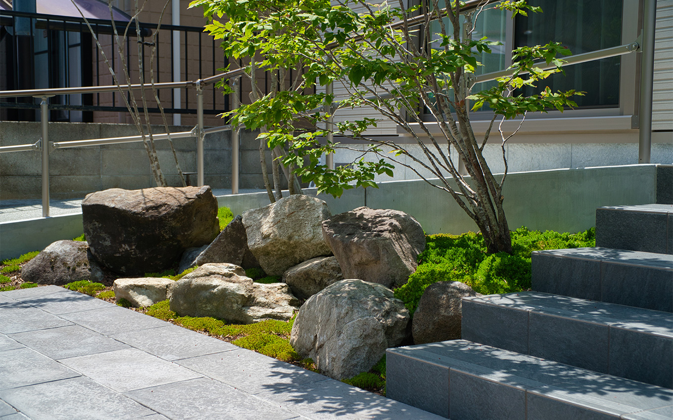 石と植栽の組み合わせにより、地面が覆われるため雑草が生えにくく、維持管理がしやすい点も魅力です。