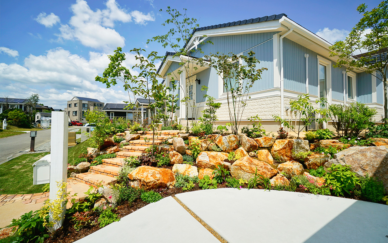 重厚感のある自然石と四季を彩る植栽を組み合わせた、ロックガーデン外構。