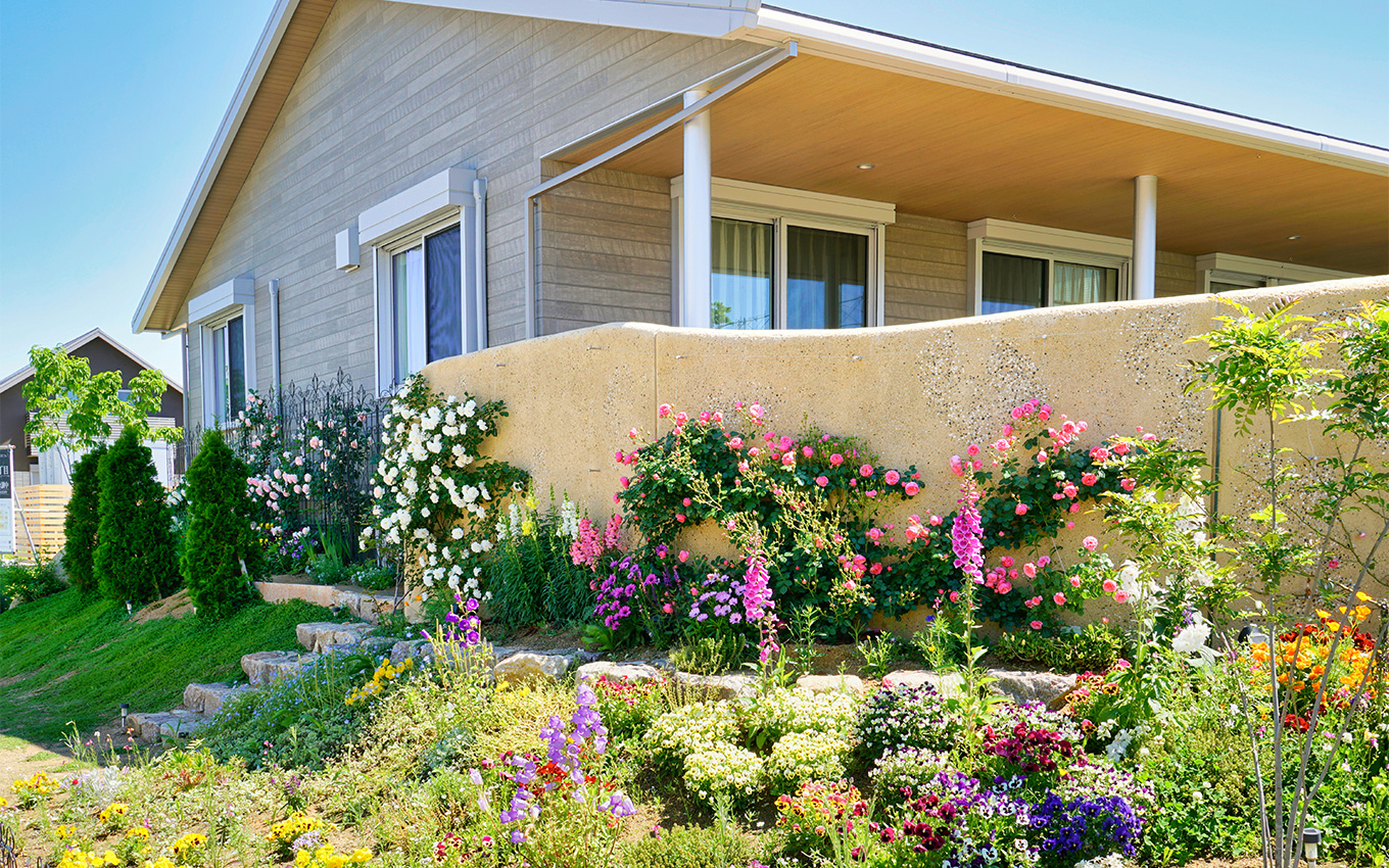 1.土地の高低差をいかした、外からは見えず圧迫感のない、お花が映える目隠し壁