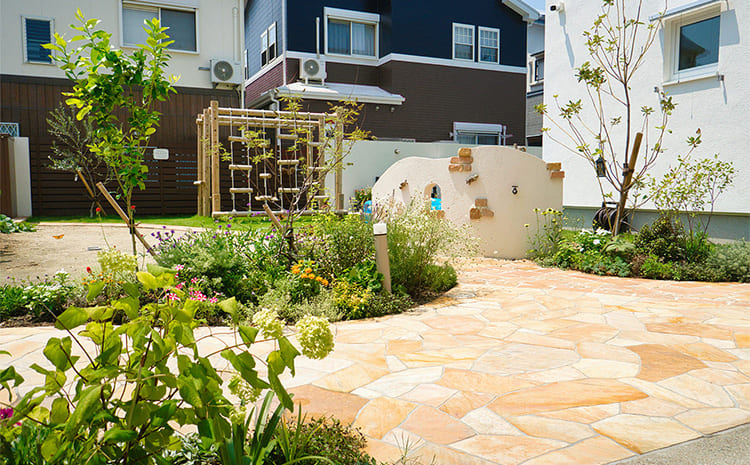 私たちフィーリングガーデンは、大阪府吹田市で新築外構工事や外構リフォーム工事を長年手がけてきました。広い敷地を生かし建物に合わせた外構のトータルデザイン、高低差に対応した土留め工事、斜面地の有効活用など、さまざまなご要望や課題を抱えたお客様からご依頼をいただいています。