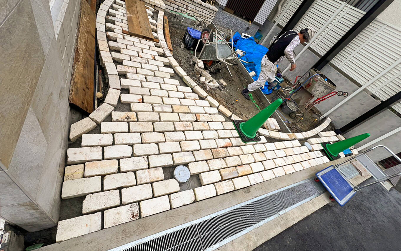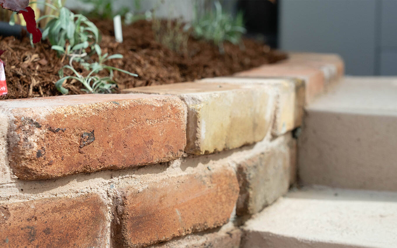 アプローチには優しい色合いのアンティークレンガを取り入れて、なだらかな曲線ラインに。雑草を抑えつつ、癒しをもたらす植物で彩りを添えて、日々のストレスも自然と軽減される、優しい印象のお庭が完成しました!