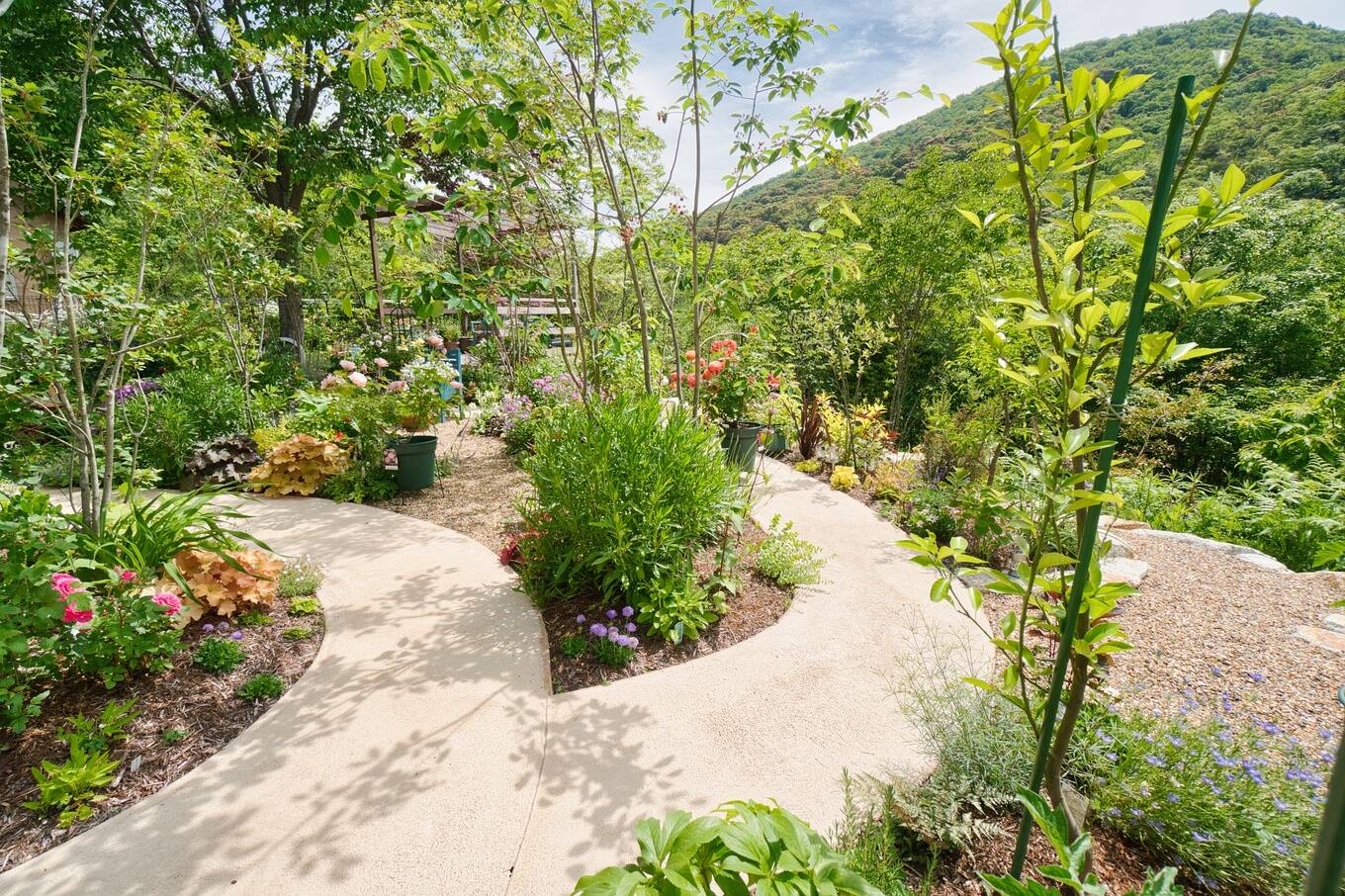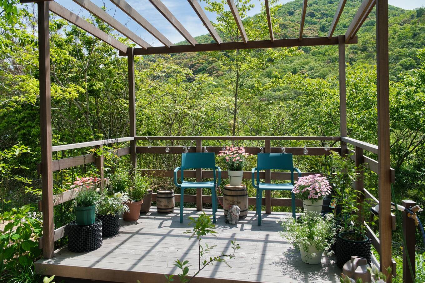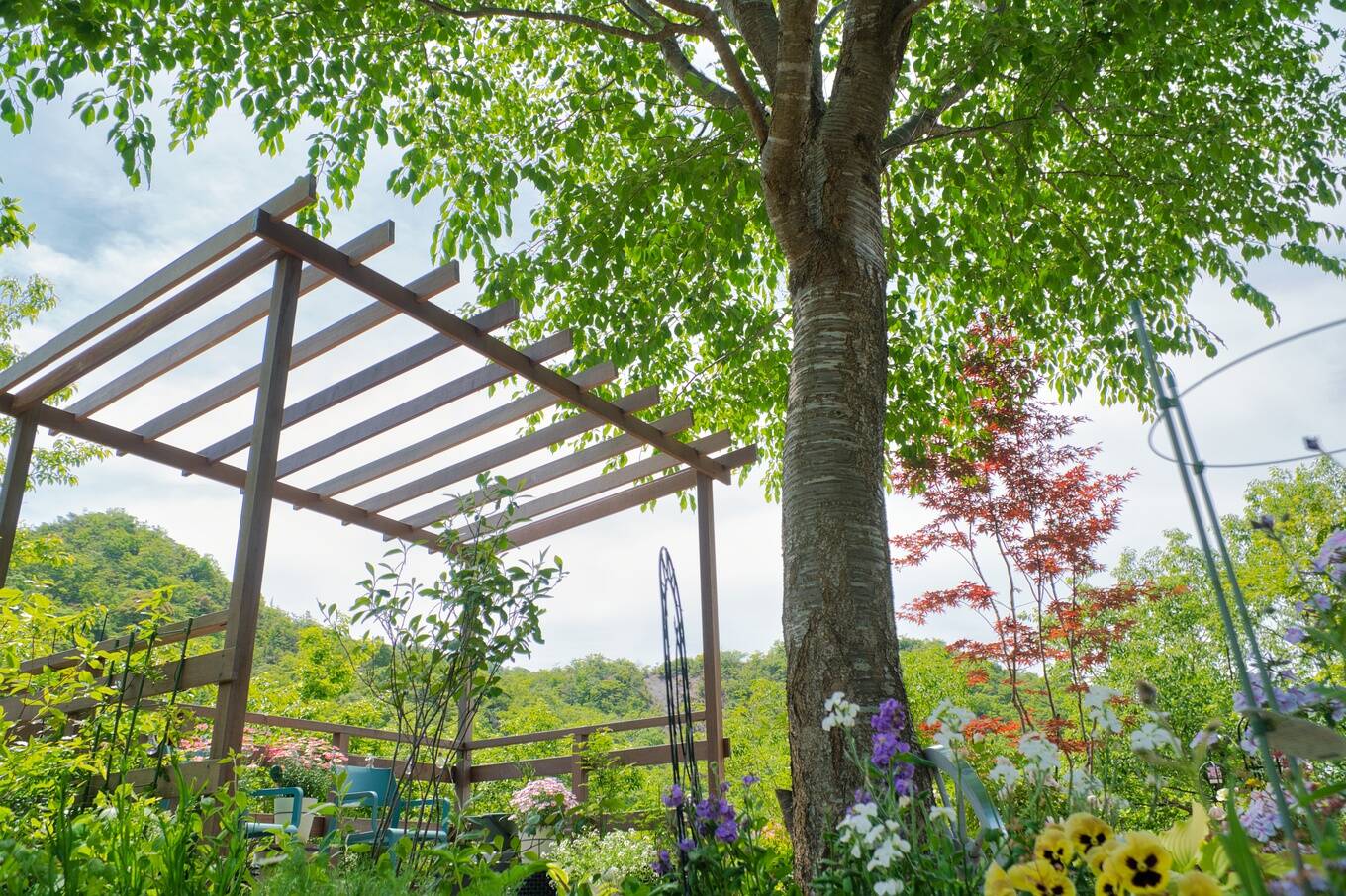 木々の間から見える山を借景として美しく取り入れるために、樹木の高さ調整などに気を配りました。