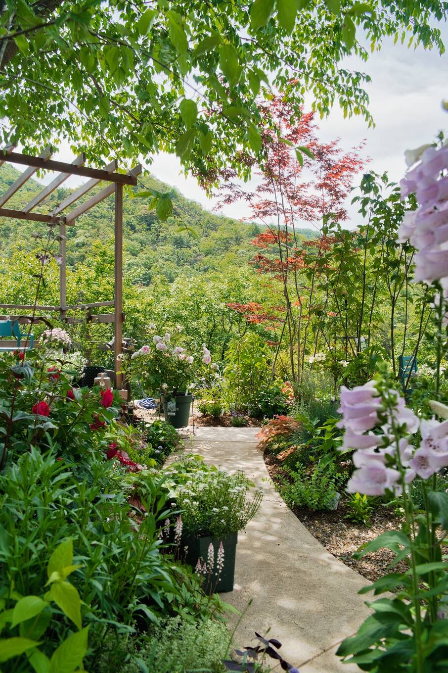 「四季を感じながら自然と調和した暮らしを楽しめるお庭を」とのことで、美しい山を借景として取り入れつ、花や野菜や果樹を育てて楽しめる、何時間でも過ごしたくなるナチュラルガーデンをご提案させていただきました。