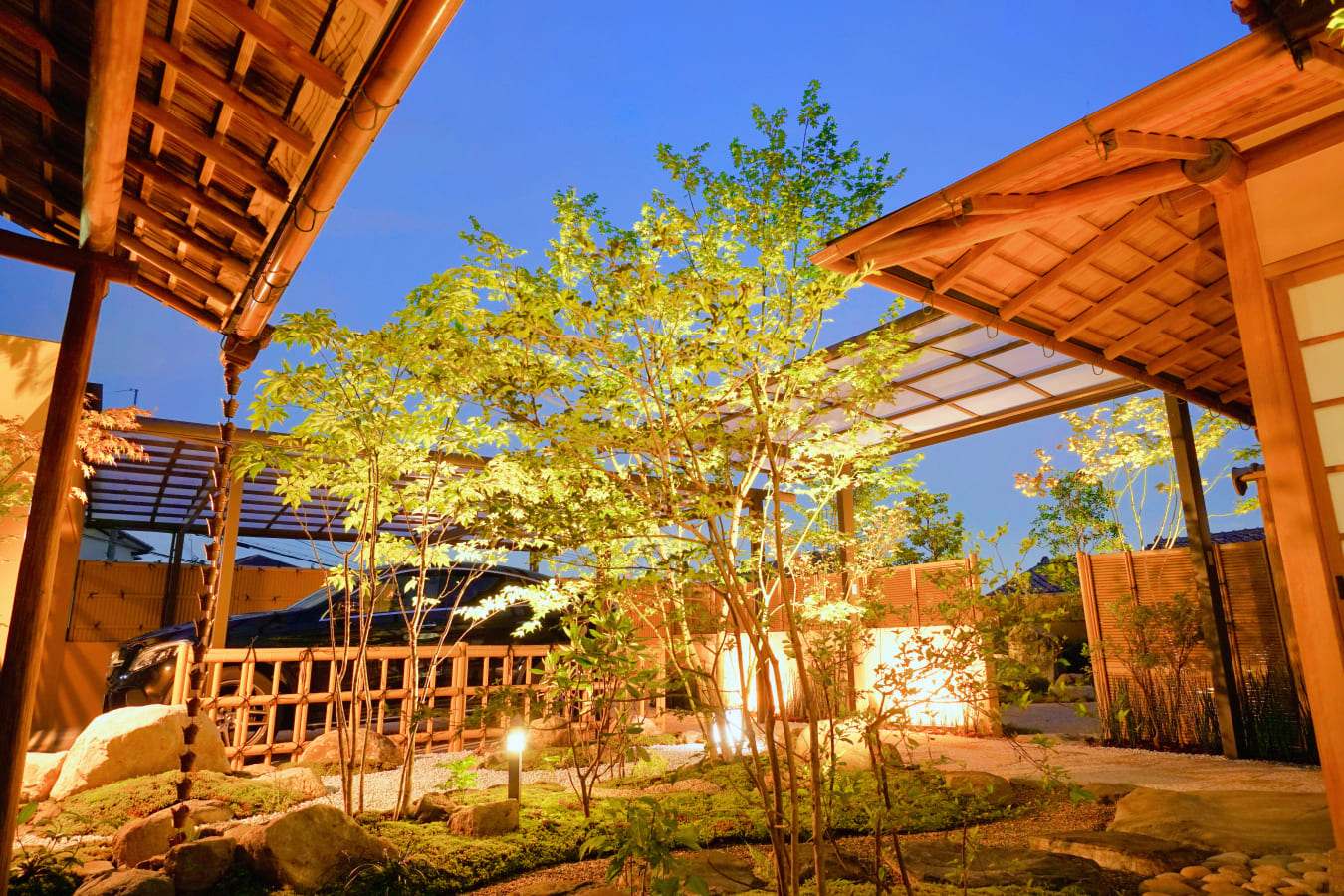 和風のお庭がお好きとのことで、数寄屋建築に似合うお庭を使い勝手良くデザイン。木の高低差を活かす配置で、玄関の数寄屋門から眺めたお庭に奥行きを感じられるよう演出しました。