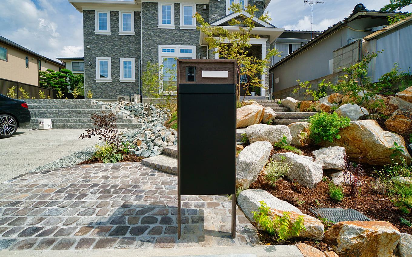 洋書に載っているような植物いっぱいのナチュラルなアプローチをご希望で、イメージスケッチまで用意されていた施主様。スケッチを元に、既存の擁壁にも馴染むナチュラルなロックガーデンをご提案。道路との高低差をいかして、変化のある素敵なアプローチができました。