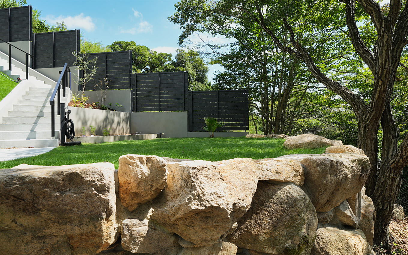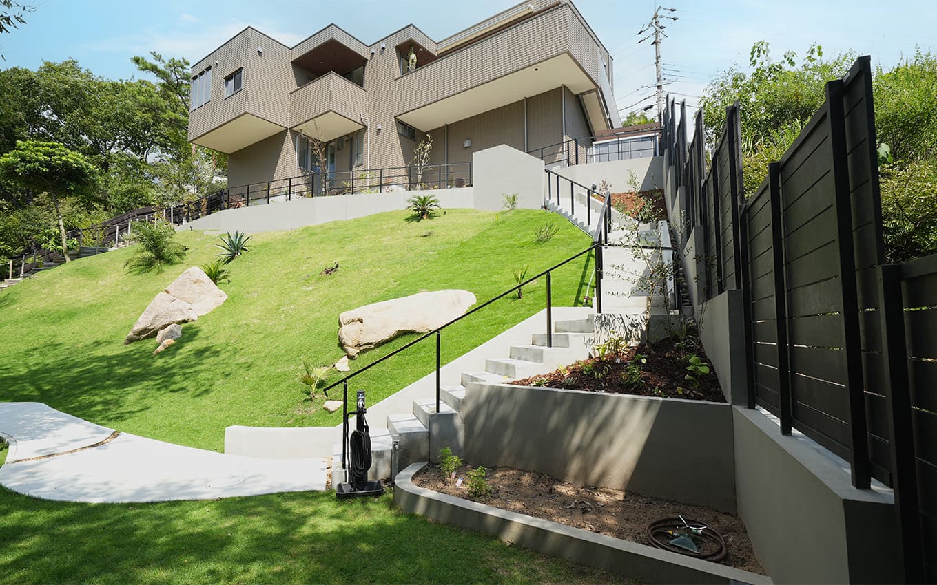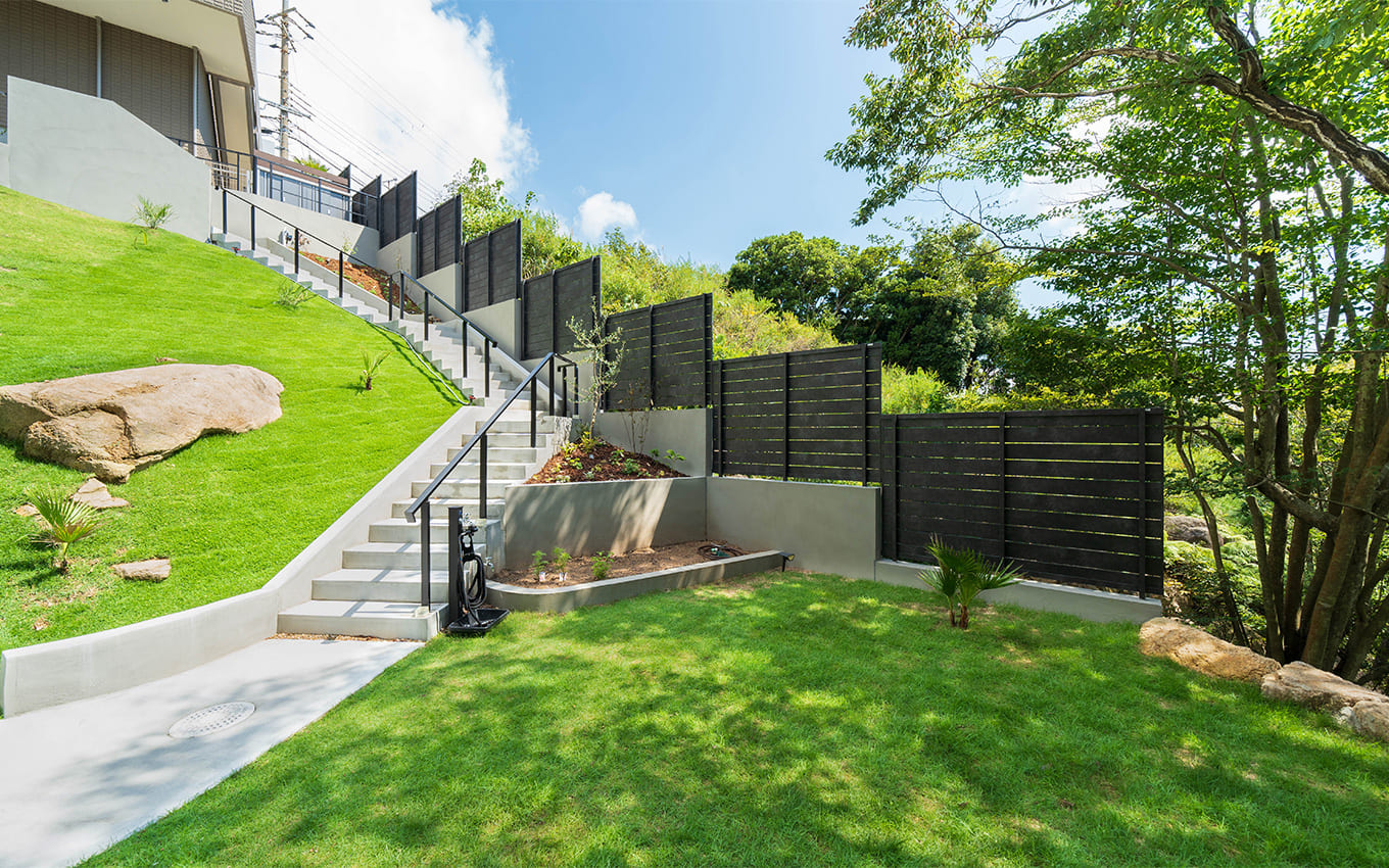 西宮市にて、ヘーベルハウスにお住まいのお客様よりご相談をいただき、裏手に広がる急こう配の斜面地のお庭をリフォームさせていただきました。