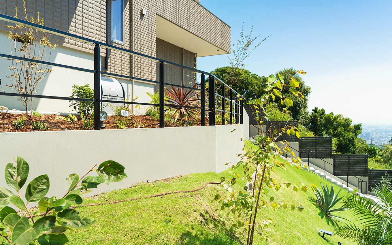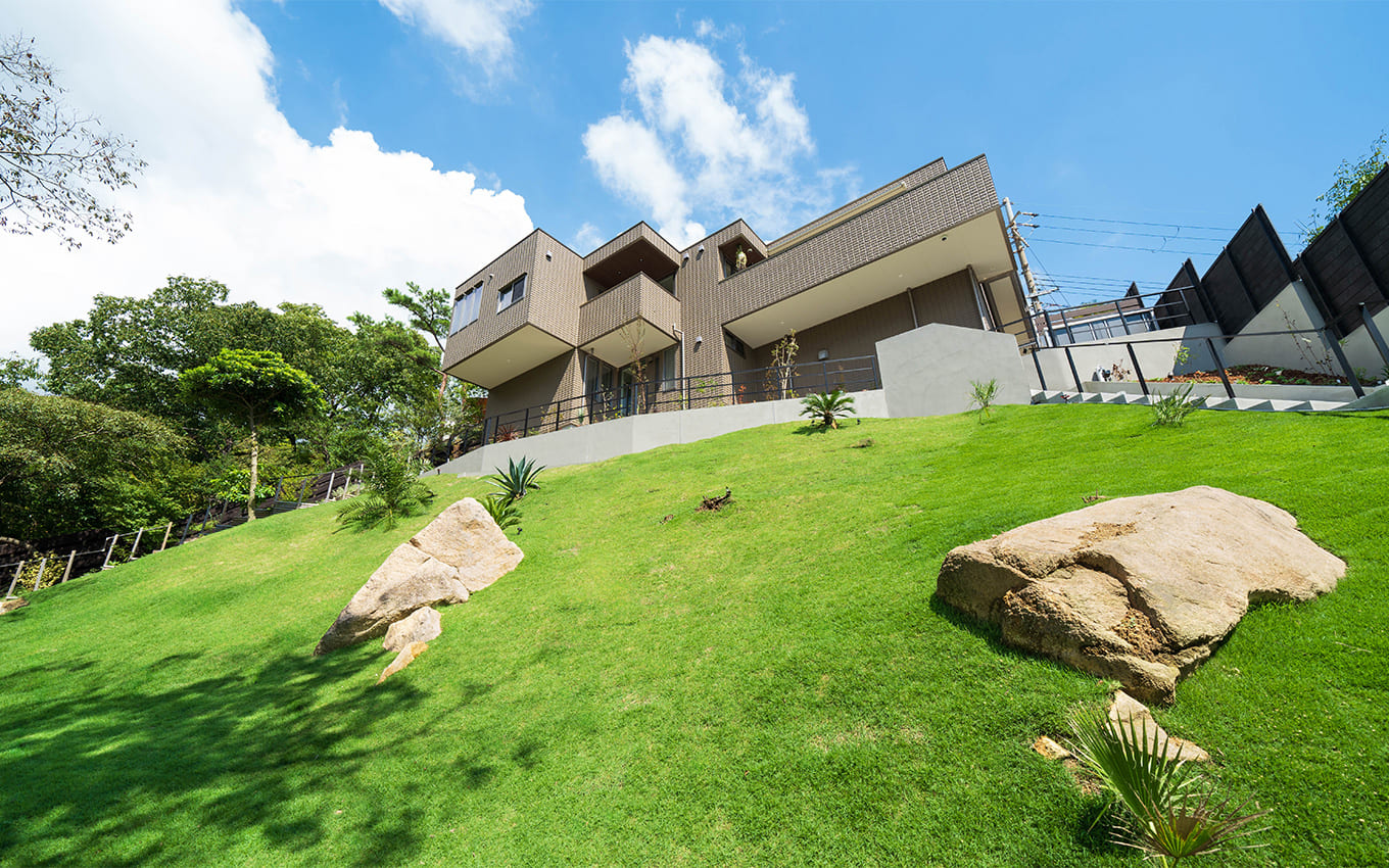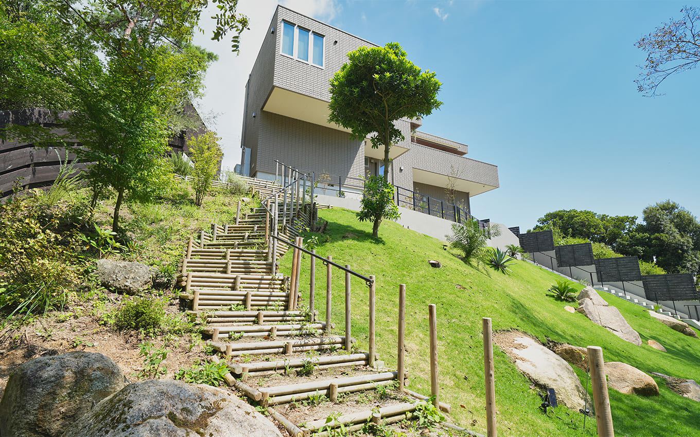 西宮市にて、ヘーベルハウスにお住まいのお客様よりご相談をいただき、裏手に広がる急こう配の斜面地のお庭をリフォームさせていただきました。