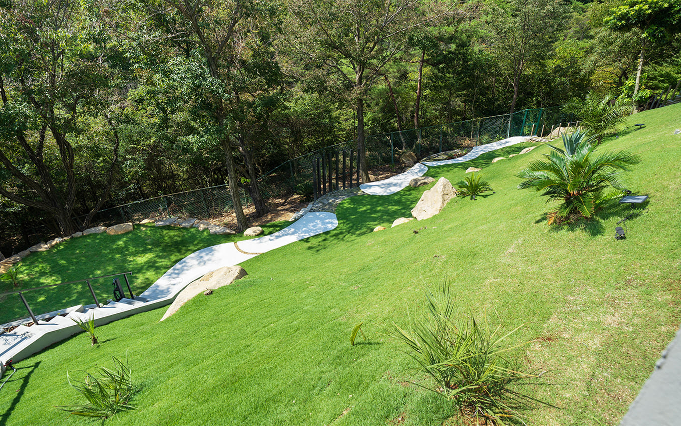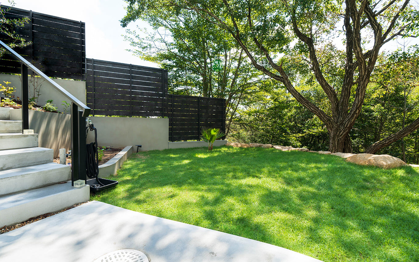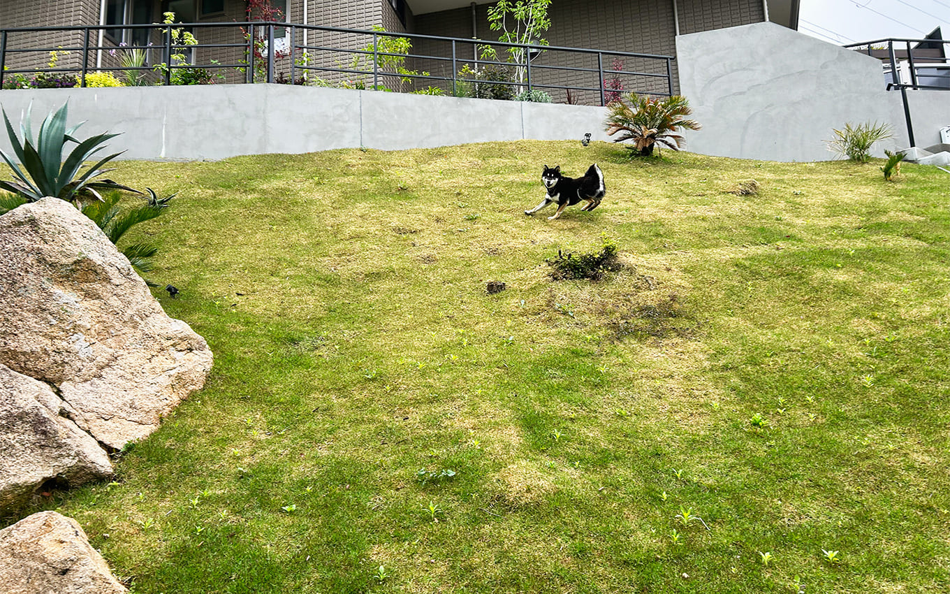 また、広い斜面部分については、自然を好まれる施主様のご希望を受け、芝生でやさしく覆いました。景観を整えるだけでなく、愛犬がのびのびと走り回れる、安心感のある空間へと生まれ変わっています。