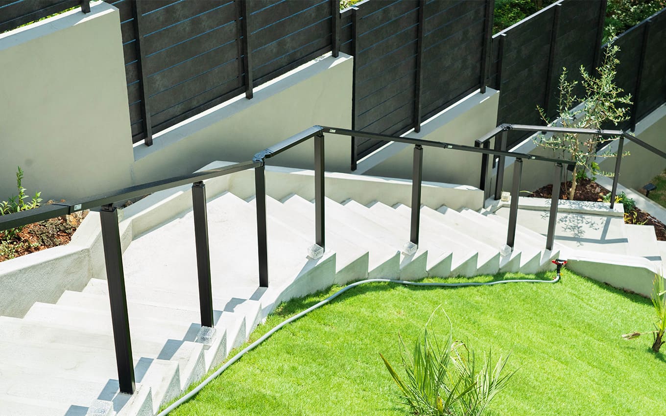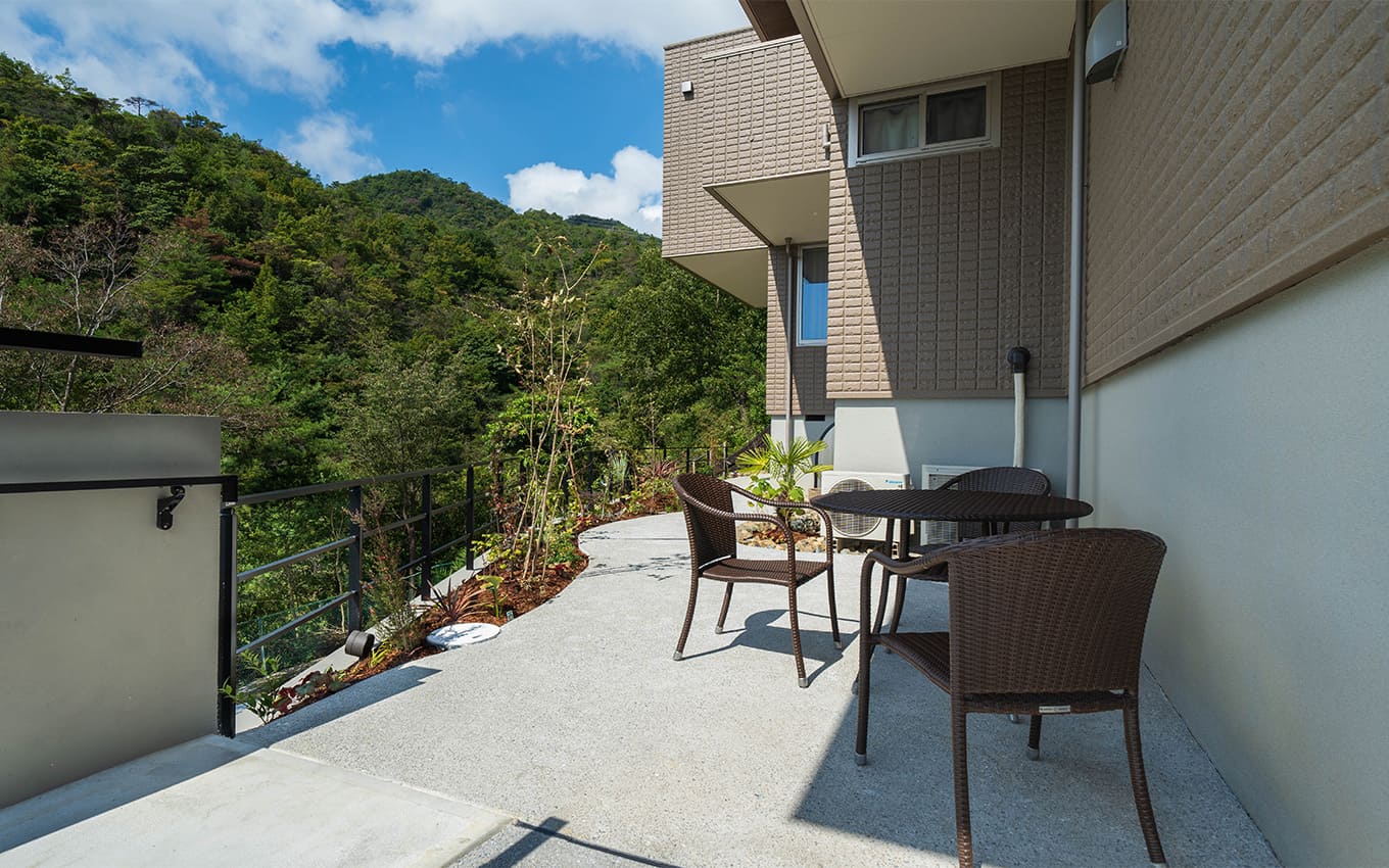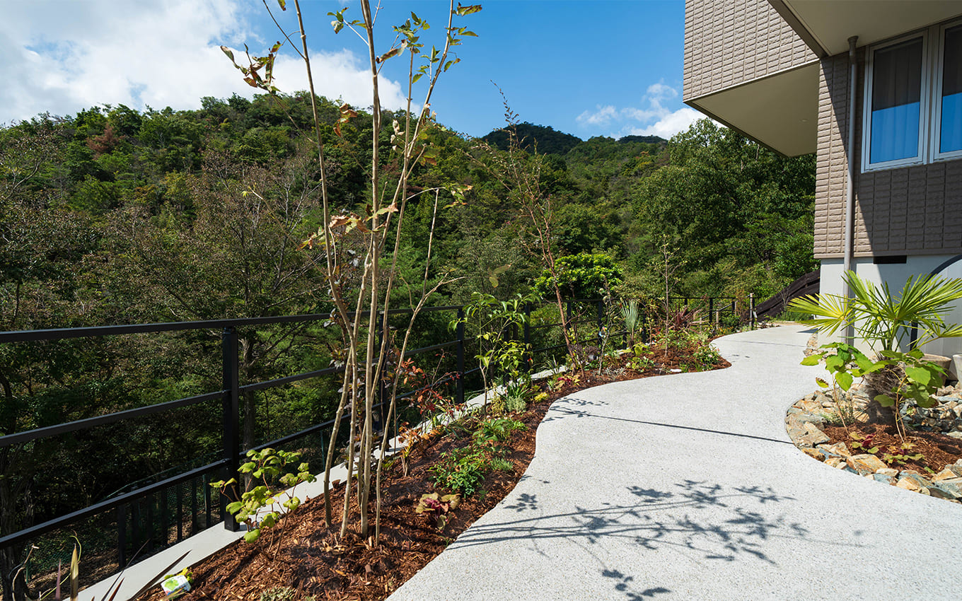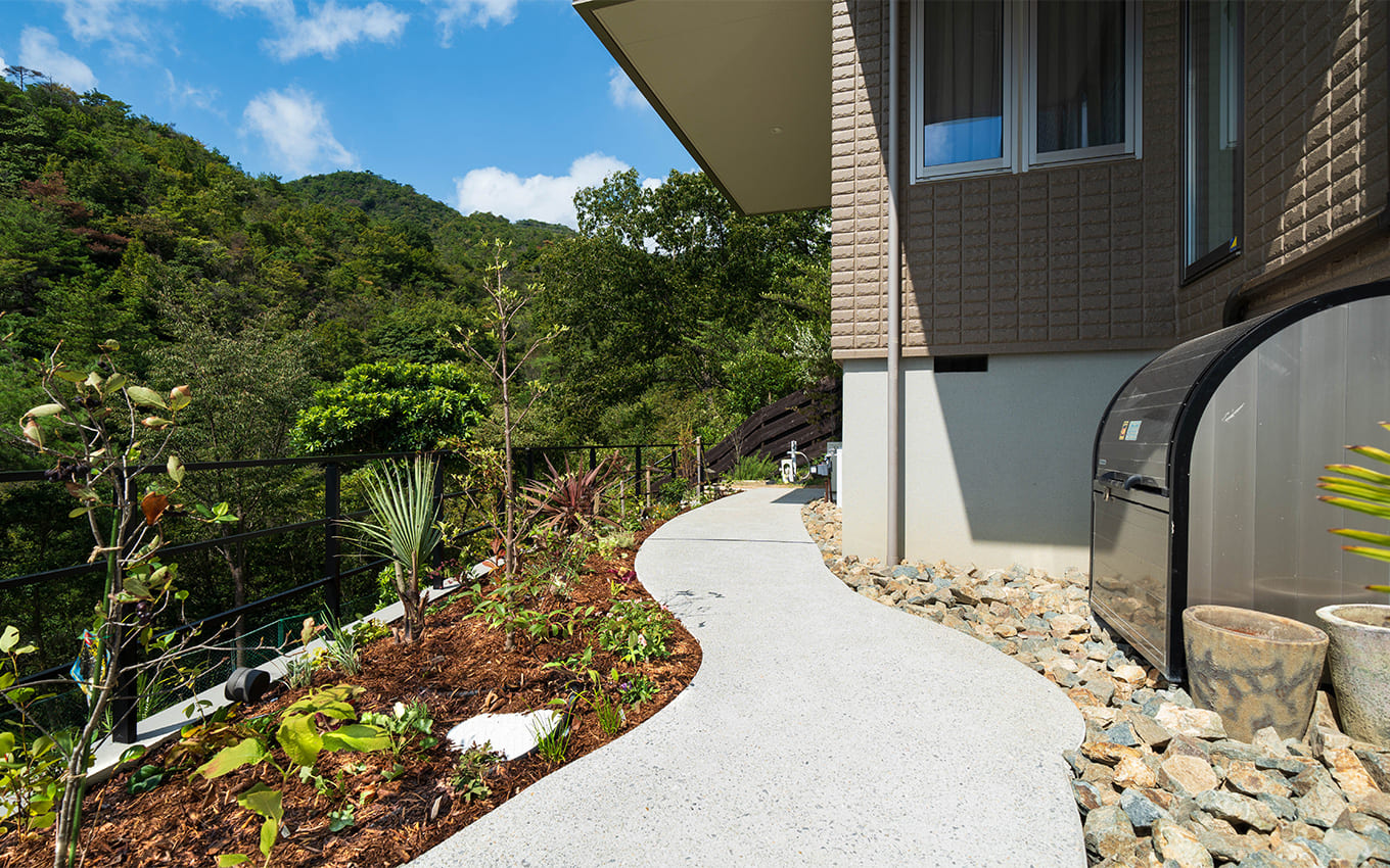 そこでまず、安全に外へ出られる環境を整えることを大切にしました。住まいのすぐ外には、ゆったりと過ごせるテラスと転落防止フェンスを設置。あわせて、手すり付きの階段と強固な土留めを整備し、安心して上り下りできる動線を確保しました。さらに、斜面の最下部には平らなスペースを設け、気軽に外の空気を楽しめる場所をつくっています。
