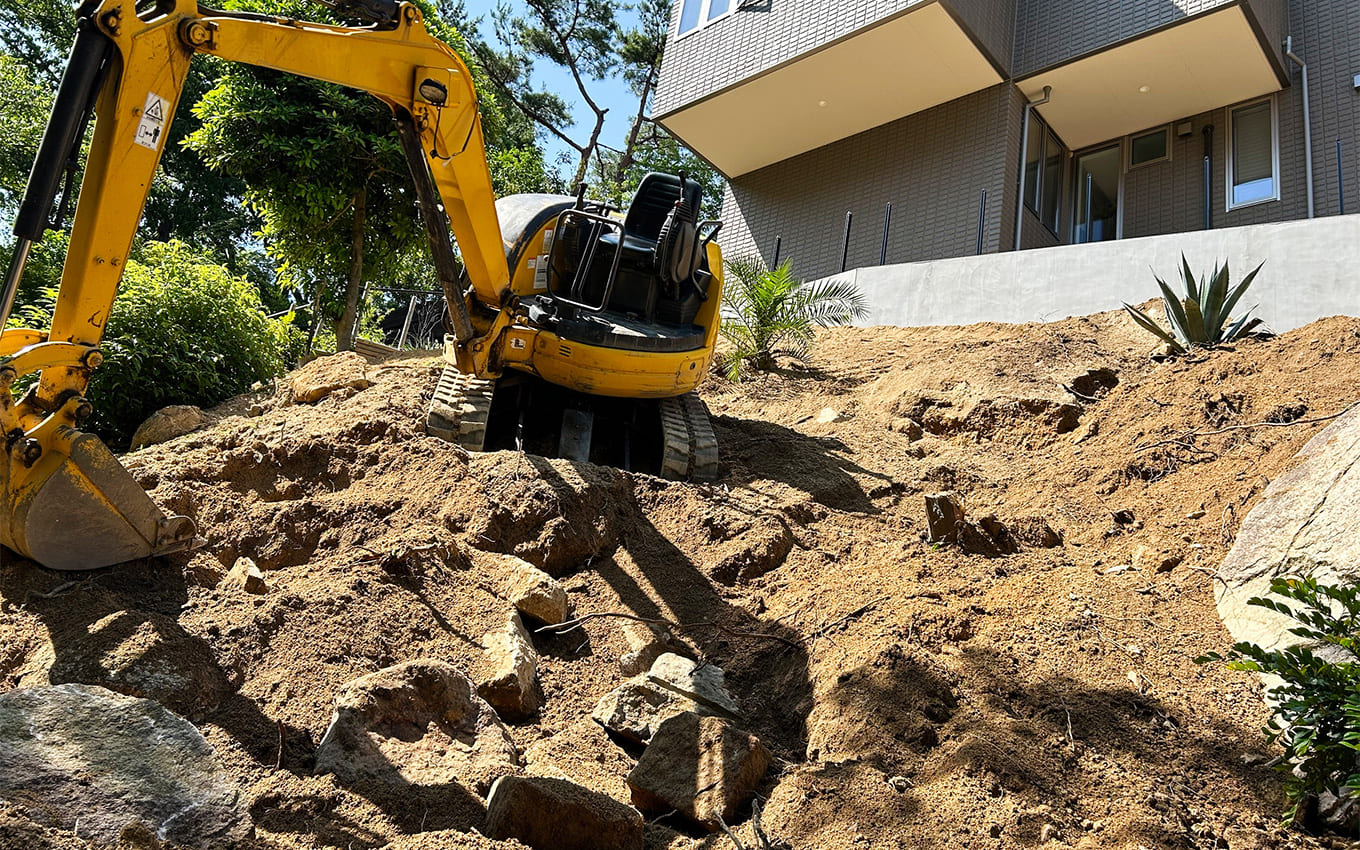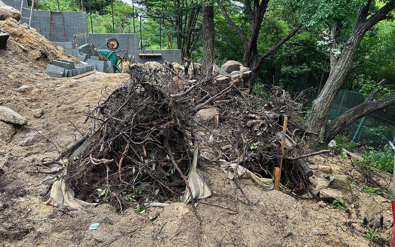 こちらのお庭は、敷地の大半が傾斜地であり、大きな石や切り株、雑草も多く、虫も発生しやすい環境でした。そのため、安心して足を踏み入れることが難しく、手すりもない状況から安全面へのご不安も抱えておられました。毎日目に入る場所でありながら、次第に足が遠のき、気持ちの上でも少し重たく感じられる空間になっていたそうです。