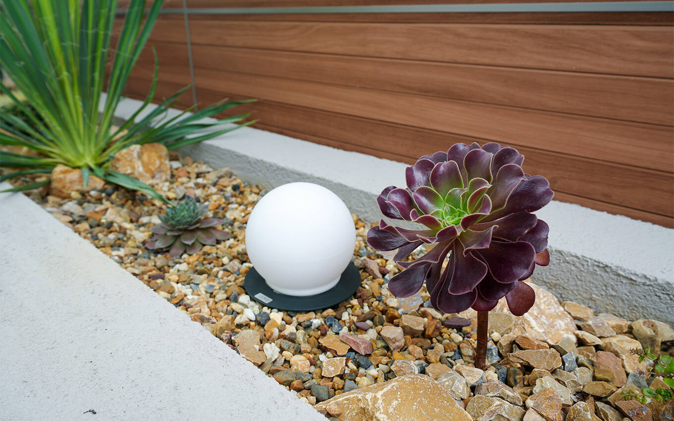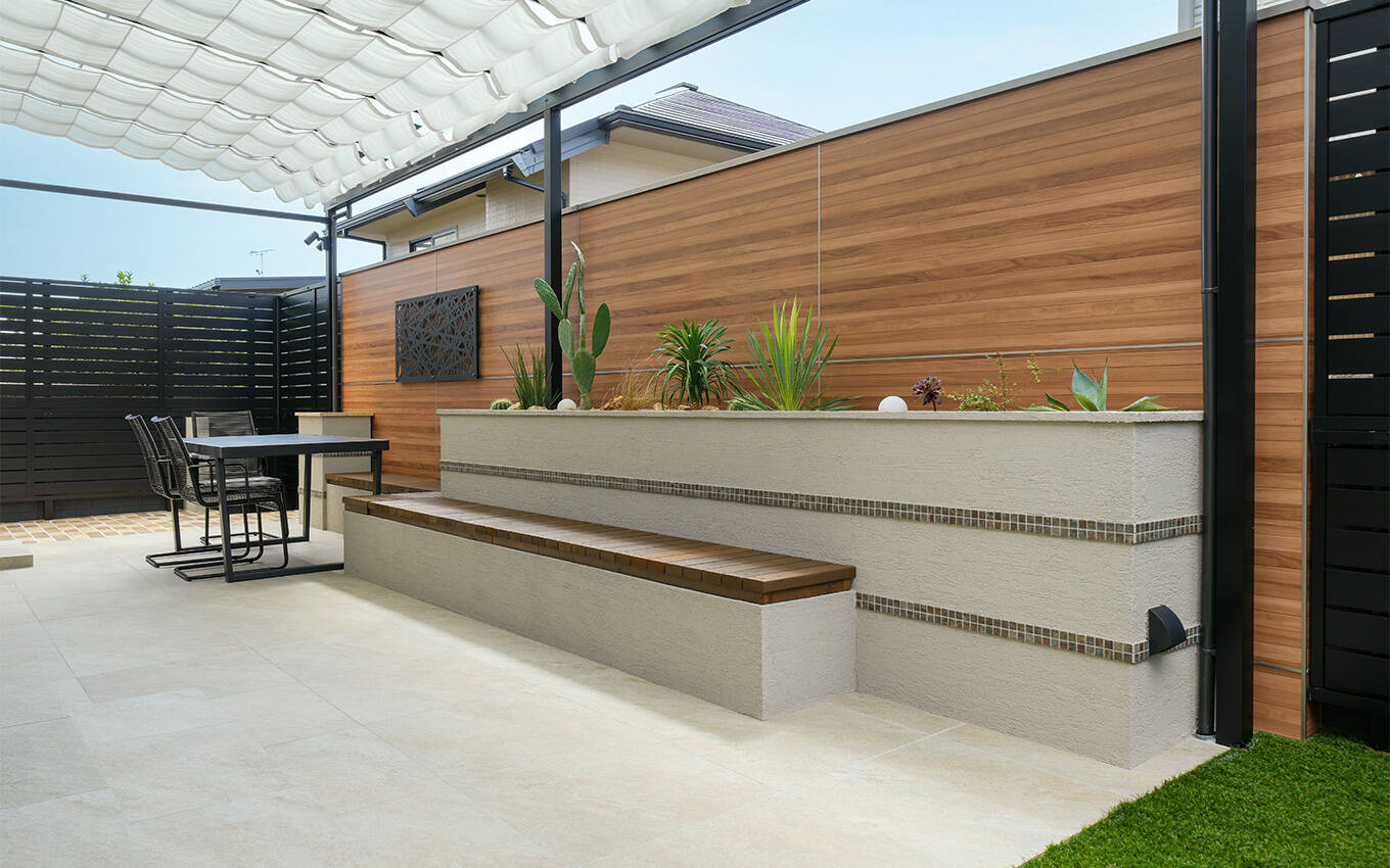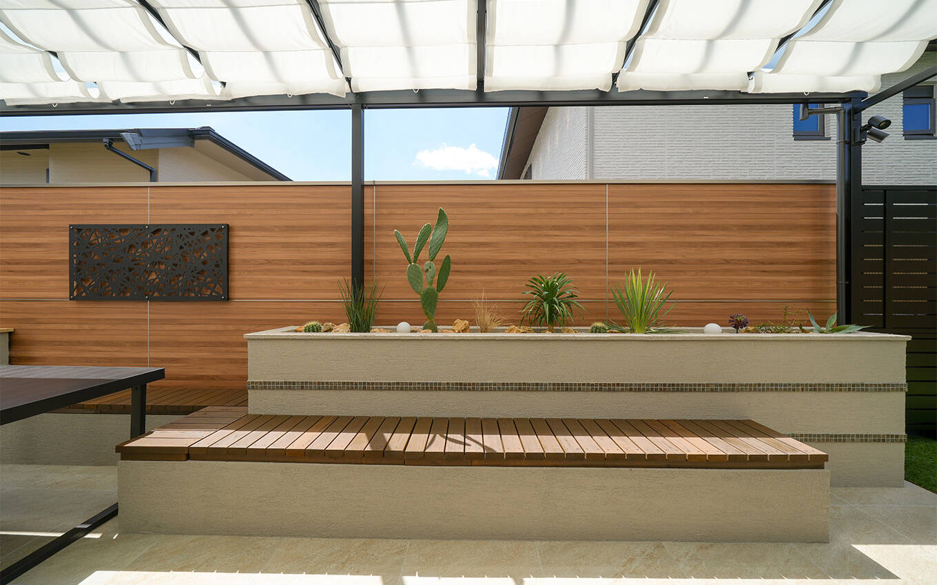 乾燥に強い植物とアートボードで作りこんだリラックス感のあるスペースは、夜には美しくライトアップ。片付けにも大活躍の収納つきベンチがあるので、いつでも気軽に腰かけてくつろぐことができます。
