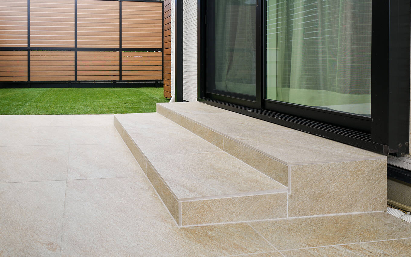 掃き出し窓の前には、ワンちゃんも使いやすい幅と高さの階段を設置。ドッグランはミストつきで、真夏の外遊びも快適です。
