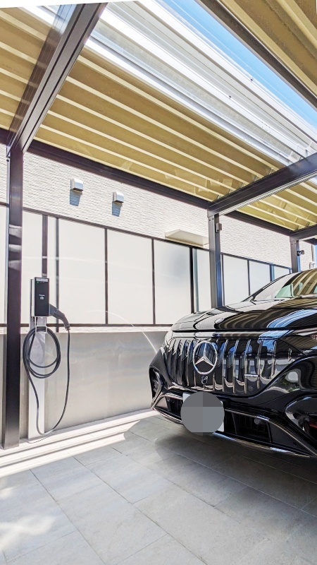 車から玄関までは雨に濡れずに移動できる屋根動線も確保。