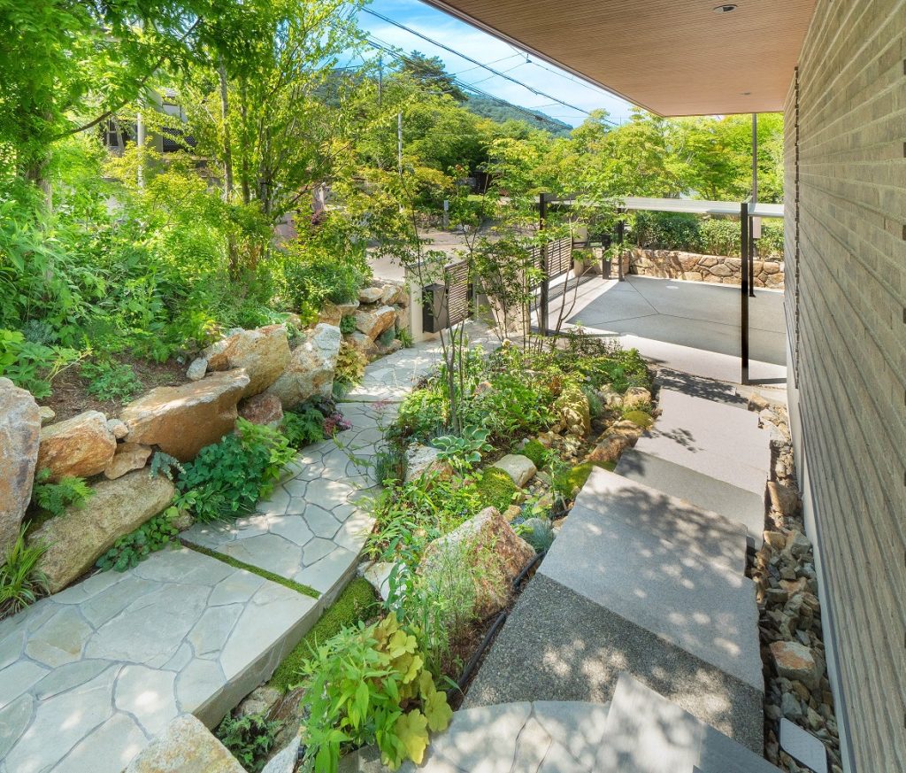 自然の流れとロックガーデンが静かに調和し、玄関へ向かうアプローチにはやさしい時間が流れています。