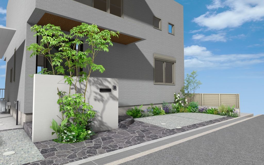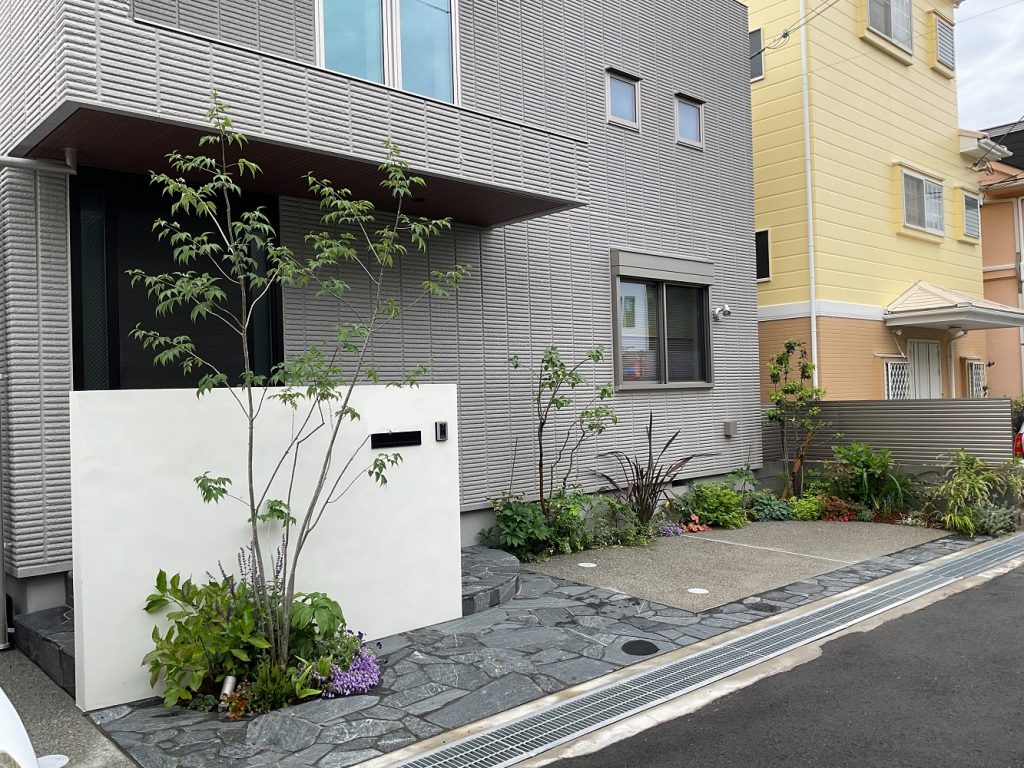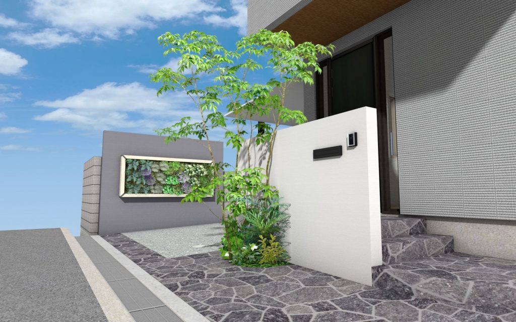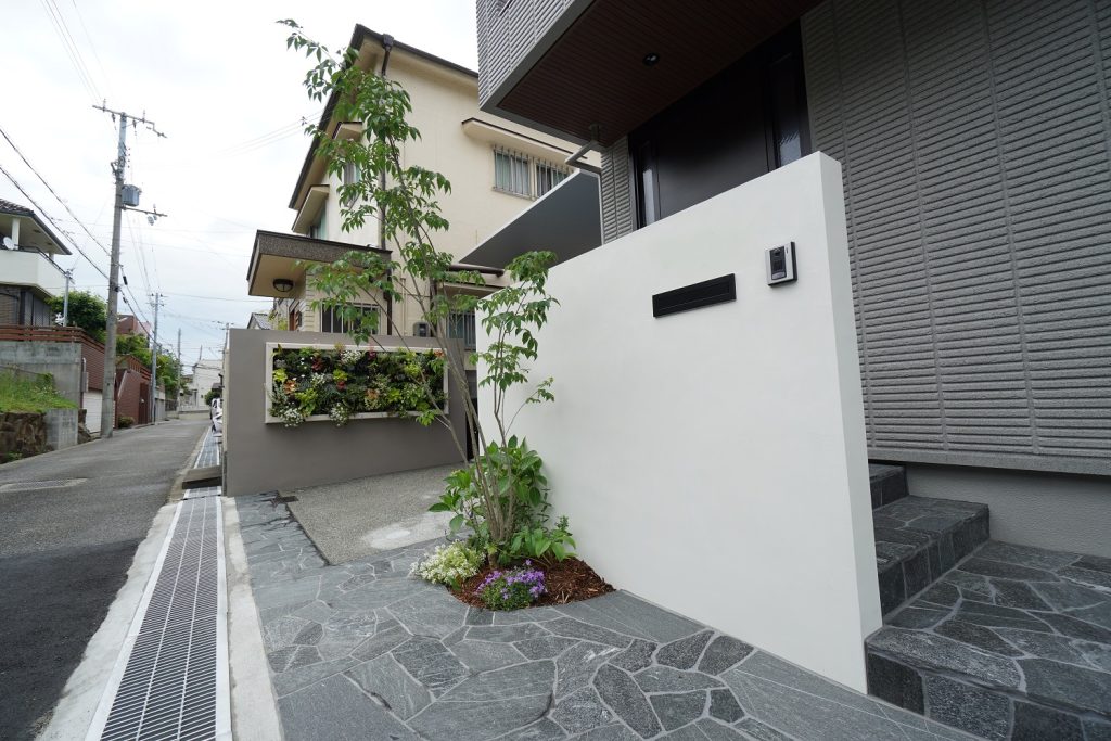今回の外構で特に印象的だったのが、壁面を活かした緑の演出です。限られたスペースでも、視線の高さに緑を取り入れることで、空間は一気に豊かになります。壁面緑化は、単に植物を増やすだけでなく、暮らしの中に“奥行き”と“静けさ”をもたらしてくれます。季節ごとに少しずつ表情を変える葉の色や揺らぎは、まるで絵画のように日常に寄り添ってくれる存在です。外から帰ってきたとき、ふと視界に入る緑に心がほどける——そんなささやかな贅沢を感じていただけるよう、配置には細やかな配慮を重ねました。平面だけでなく、空間全体で緑を楽しむ。そんな新しい外構のかたちが、ここに生まれました。