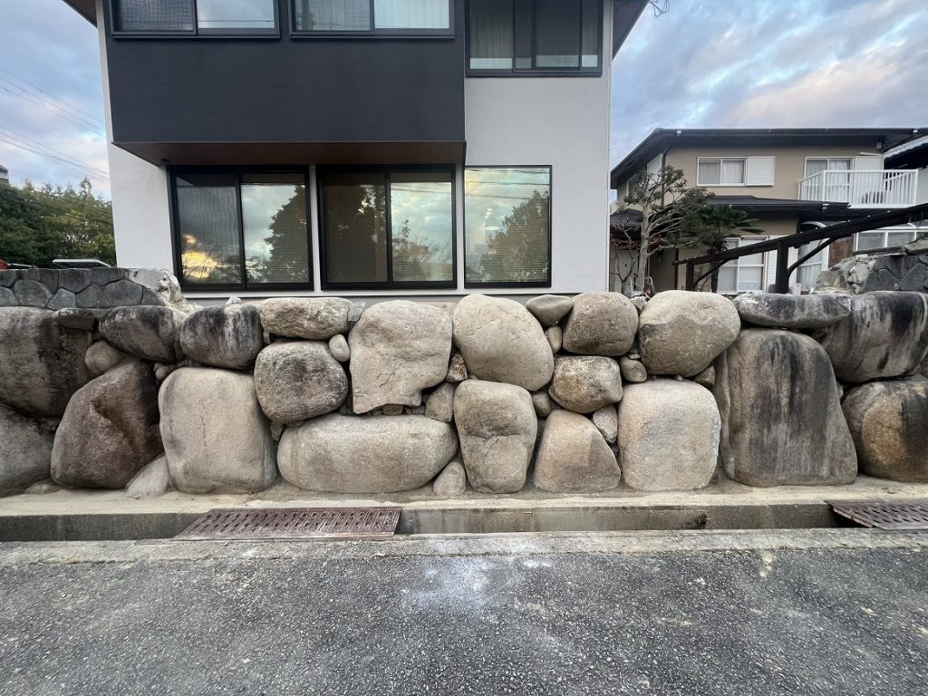 新築後の外構では、駐車場とお庭の間に生じた高低差を活かし、既存の石を用いてロックガーデンをつくりました。
