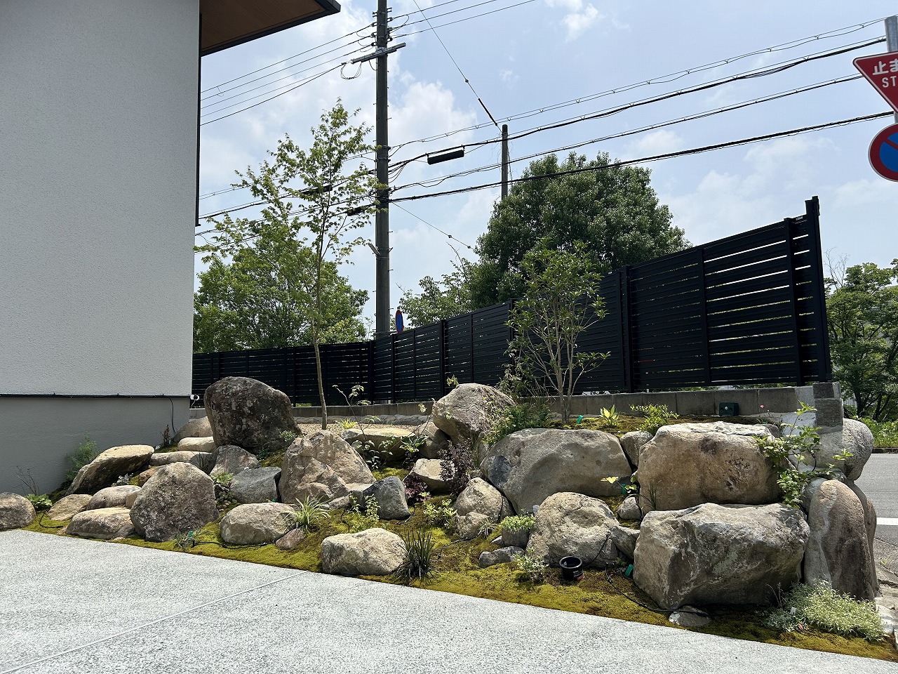 新築後の外構では、駐車場とお庭の間に生じた高低差を活かし、既存の石を用いてロックガーデンをつくりました。