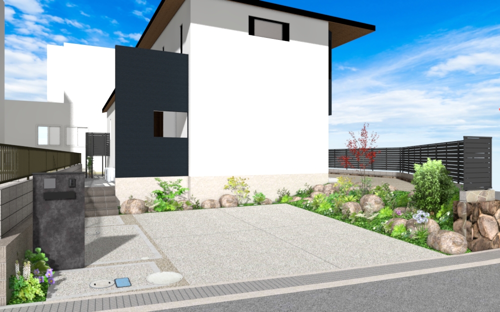 ローメンテナンスで和の趣を感じられる外構を目指し、既存の石もできれば活かしたいという施主様の想いから、
