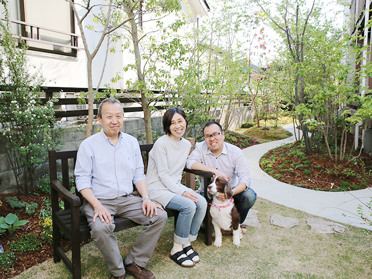 リビングや書斎から庭の木々を眺めて楽しみたいという施主様のご希望を叶えるため、部屋の中から眺める風景を考えてデザインしました。まるで信州の別荘のようなお庭にワンちゃんも大満足。ご家族の輝く笑顔も素敵です。やはり施主様の笑顔が私達の大きなやり甲斐に繋がり、この仕事をさせていただいて良かった!!と喜びを噛みしめる瞬間でもあります。