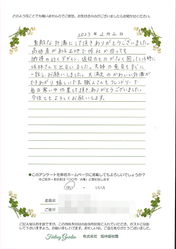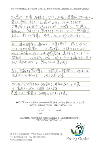 フィーリングガーデンでは、お庭・外構工事の施工完了後に、対応・仕上がりに関するアンケートを実施しています。