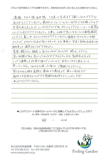 フィーリングガーデンでは、お庭・外構工事の施工完了後に、対応・仕上がりに関するアンケートを実施しています。