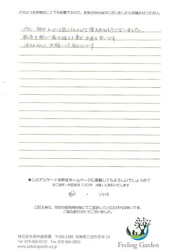 フィーリングガーデンでは、お庭・外構工事の施工完了後に、対応・仕上がりに関するアンケートを実施しています。